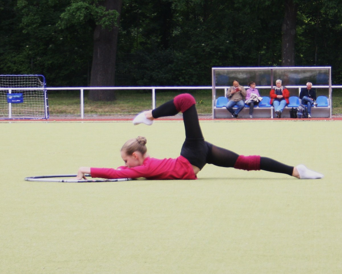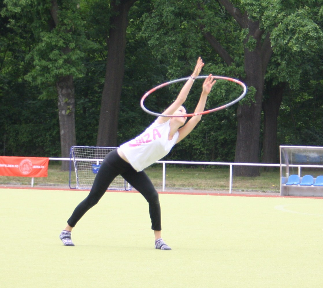 Wie sehr man seinen Körper verbiegen kann, das zeigten unter den staunenden Augen der Zuschauer eindrucksvoll die Mädchen vom VfL Zehlendorf, die mit Reifen, Keulen und dem Seil Rhythmische Sportgymnastik vorführten. Eine von ihnen war Luiza Weiß. Seit sie vier Jahre ist betreibt die 14-Jährige den Sport – mit einer kurzen Unterbrechung, als sie sich dem Turnen verschrieben hatte. „Es macht Spaß, die Bewegung, die Übungen und auch, sich total zu verrenken“, erzählte sie nach ihrer Übung. Das sei auch gar nicht so schwer. „Wenn man von Natur aus gelenkig ist, ist das einfach“, so Luiza weiter. Allerdings ist dafür auch jede Menge Übung notwendig. Dreimal in der Woche trainiert Luiza, mal eineinviertel Stunden, mal sogar vier. Neben der Schule bleibt da nicht mehr soviel Zeit für andere Hobbys.