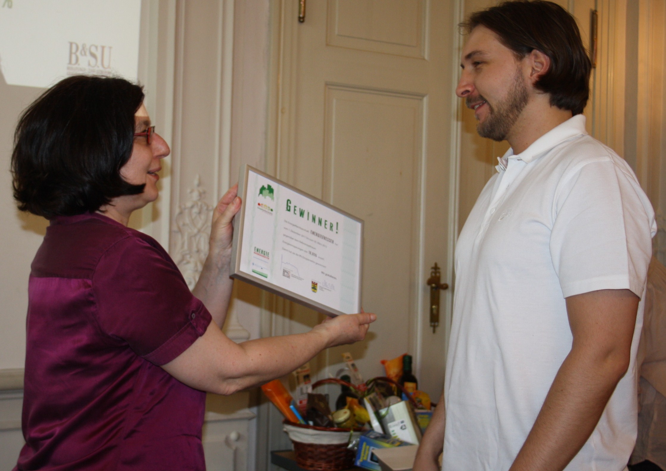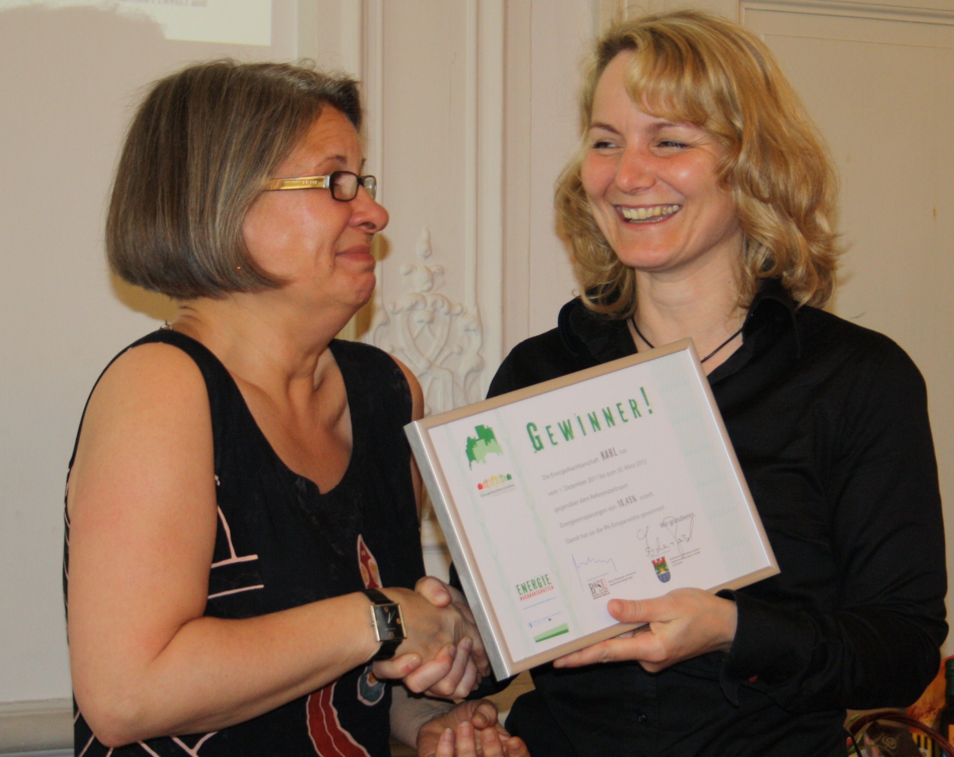 Dagmar Birkelbach, beim Umwelt- und Naturschutzamt Steglitz-Zehlendorf zuständig für den Klimaschutz, hat die Wette gern verloren. Per Handschlag gratulierte sie den zwei Teams des Bezirks, die die neun Prozent wirklich geknackt haben und überreichte ihnen ihre Gewinnerurkunden.