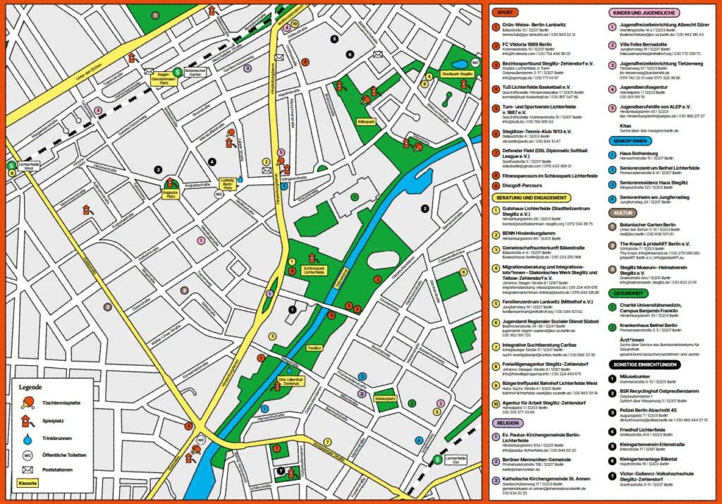 Die Übersicht zeigt etwa das Dreieck zwischen den Bahnhöfen Lichterfelde West und Ost sowie dem Stadtpark Steglitz. Anhand der Karte können Kiezbewohner sehen, wo sie eine Tischtennisplatte, einen Trinkbrunnen, einen Spielplatz oder eine öffentliche Toilette finden. Auch die Poststationen sind aufgeführt.